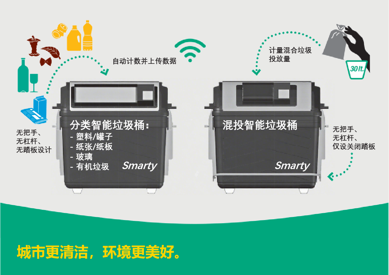 Smarty 是一款创新的智能垃圾桶,配备用户识别和垃圾称重计量功能,助力提升垃圾分类的质量。
